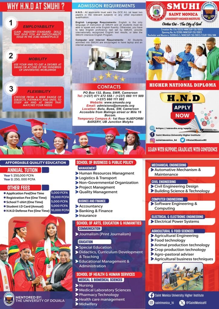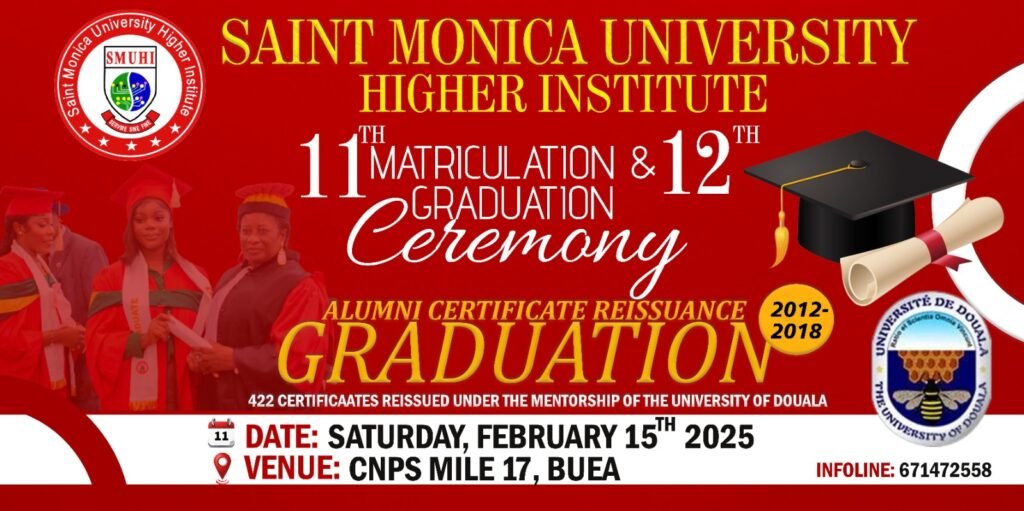 Saint Monica University (SMU), also known as “SMU Higher Institute,” is accredited by the National Commission on Private Higher Education at the Ministry of Higher Education in Cameroon. Situated in Buea, capital city of the Southwest Region of Cameroon, SMU offers